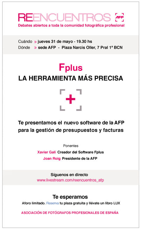 REENCUENTRO AFP “Fplus. Te presentamos el nuevo software de la AFP” Debate abierto a toda la comunidad fotográfica profesional que contará con la presencia de Xavier Galí (Creador del Software Fplus) y Joan Roig (Presidente de la AFP). ¡Te esperamos! El aforo es limitado. Reserva tu plaza gratuita (comunicacion@afpe.pro) Jueves 31 de mayo – 19.00hs Sede AFP ( Plaza Narcís Oller 7, Pral 1ª […]