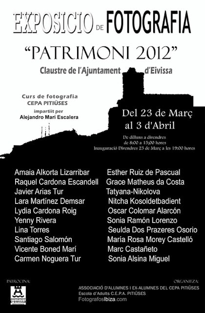 Exposición Fotográfica PATRIMONI 2013 en el Claustro del Ayuntamiento de Ibiza. Exposición de los alumnos del Curso de Fotografía del CEPA PITIüSES impartido por nuestro asociado Alejandro Marí Escalera. La exposición se podrá visitar hasta el día 5 de abril Horario: de lunes a viernes de 8h a 15h