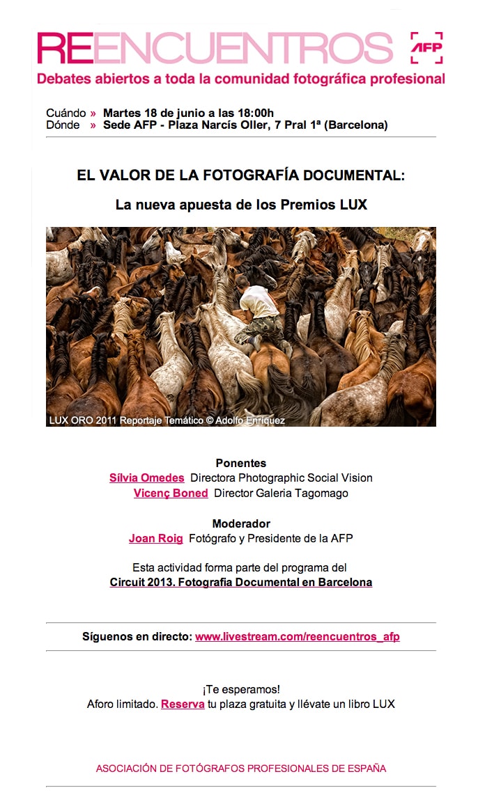 [flagallery gid=2 Name=”Reencuentro El valor de Fotografía Documental”] Ayer tuvo lugar el Reencuentro “El valor de la fotografía documental, la nueva apuesta de los Premios LUX”, de nuevo en la sede de la Asociación después de los Reencuentros AFP en el Palau Robert. Desde la Asociación consideramos fundamental dar mayor visibilidad al colectivo de fotógrafos […]