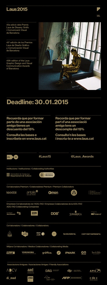 La Asociación de Directores de Arte y Diseñadores Gráficos (ADG-FAD) convoca a los profesionales del diseño y la comunicación visual a participar en la 45ª edición de los Premios Laus. El plazo de inscripción está abierto hasta el día 6 de febrero de 2015. Los asociados a la AFPE podrán beneficiarse de un descuento del 15% en las inscripciones. Consulta las bases […]
