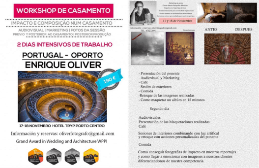 Te presentamos el workshop intensivo de Boda que organiza nuestro asociado Enrique Oliver. Los asistentes trabajarán en sesiones de exterior e interior y tendrán la posibilidad de retocar sus propias imágenes. Además, se tratarán temas de marketing de ventas y cómo maquetar un álbum de boda en 15 minutos. Fecha: 17 y 18 de noviembre Lugar: Oporto […]