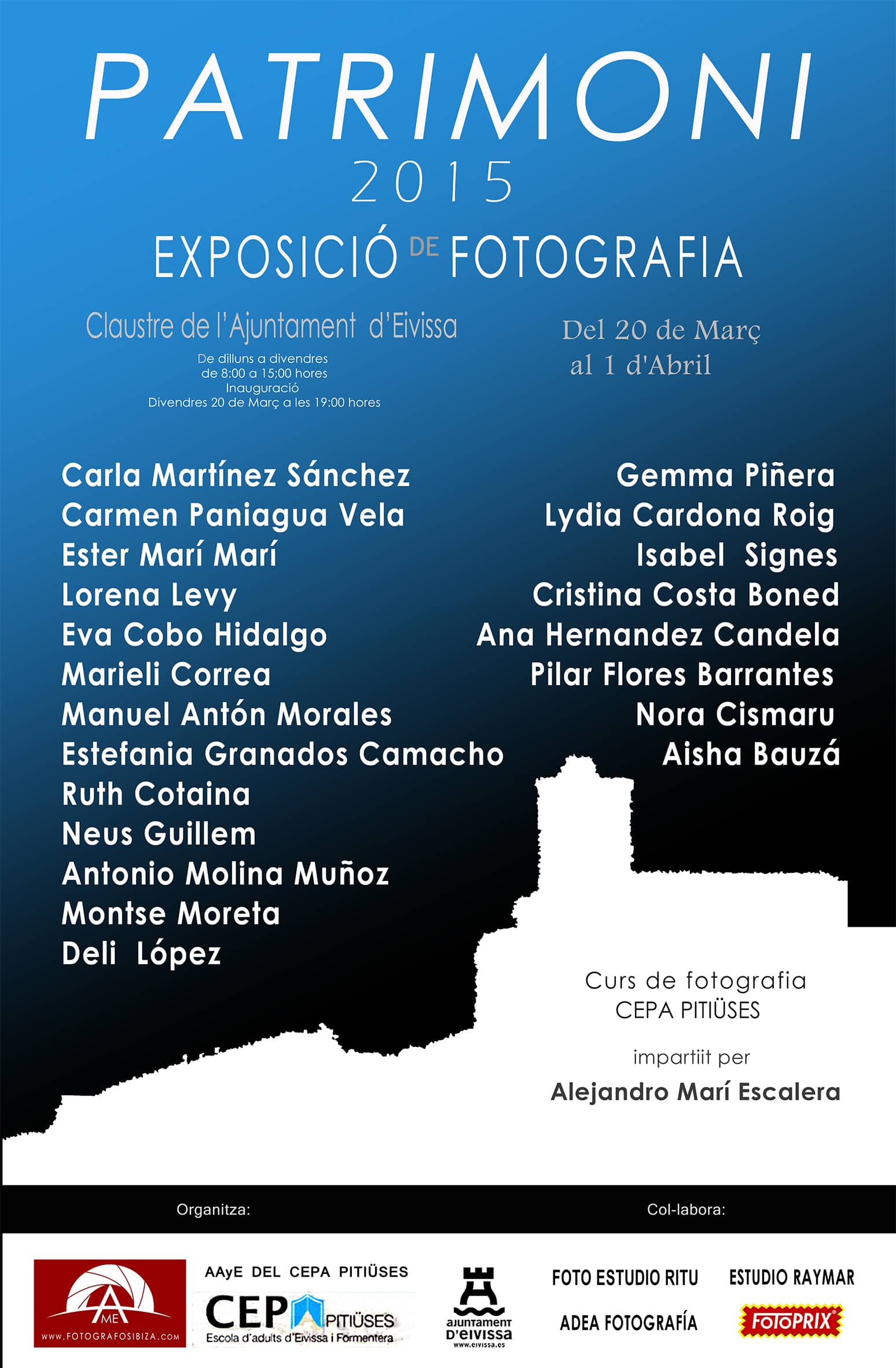 Exposición Fotográfica PATRIMONI 2015 en el Claustro del Ayuntamiento de Ibiza. Exposición de los alumnos del Curso de Fotografía del CEPA PITIÜSES impartido por nuestro asociado Alejandro Marí Escalera. Los Autores de la exposición desarrollan libremente su visión del patrimonio histórico y cultural de Ibiza con fotografías en color o blanco y negro. La exposición se podrá visitar hasta el día 1 de abril. Horario: de lunes a viernes de 8h a 15h