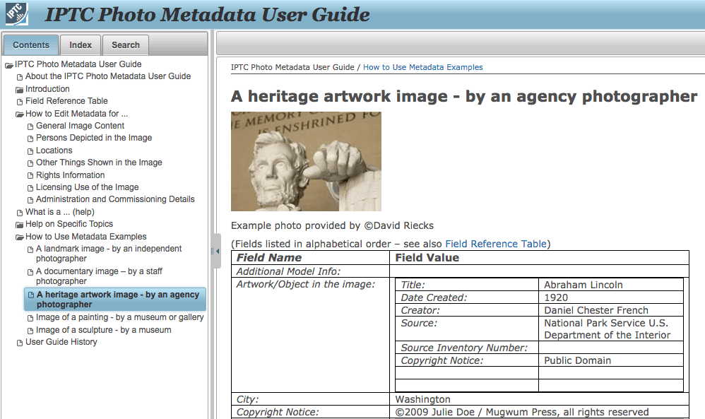 La Guía del usuario de metadatos fotográficos guía a los usuarios a través de los principales grupos de metadatos y, para cada campo, proporciona pautas cortas sobre el uso y la semántica.