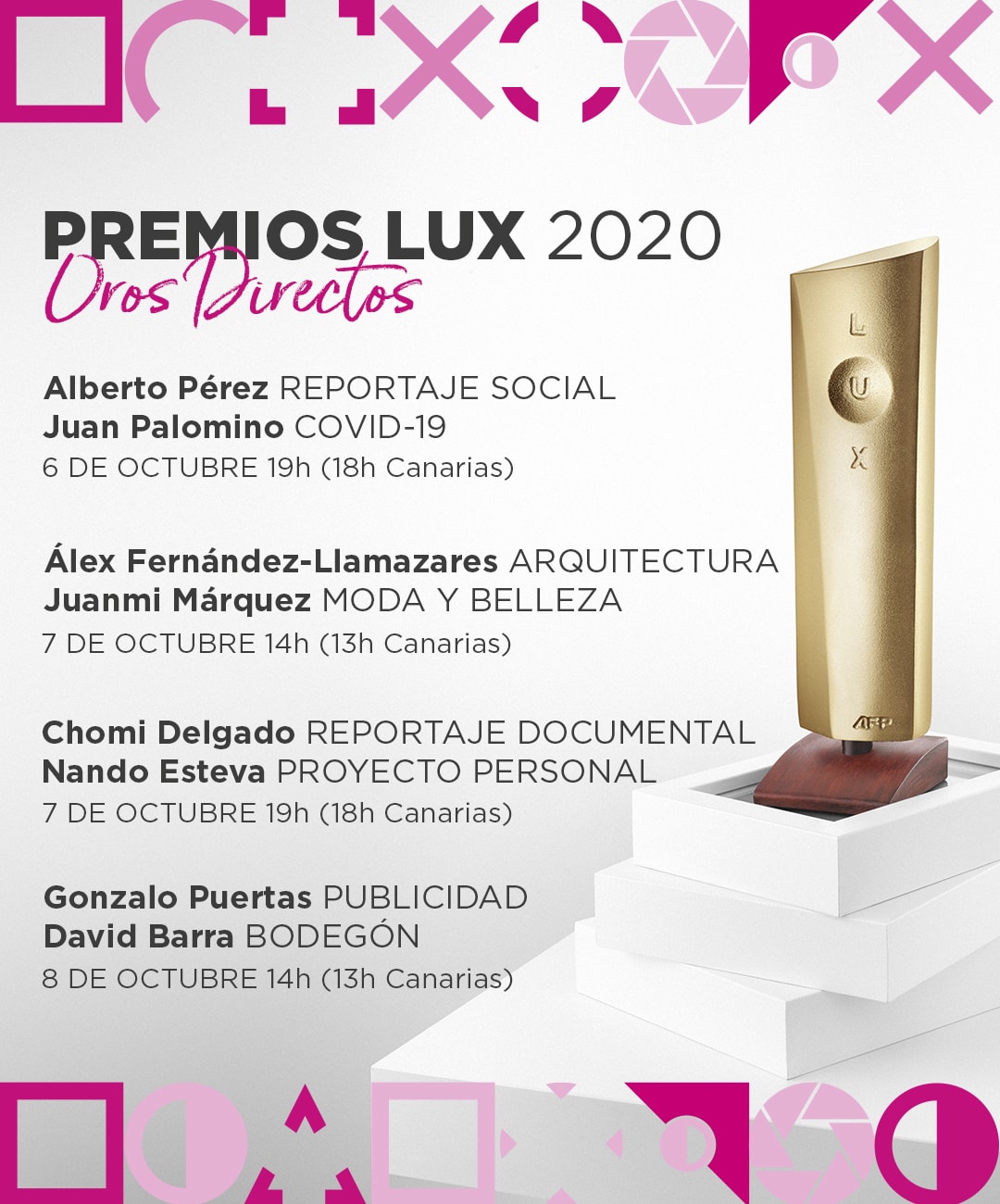 A partir de esta tarde a las 19h (18h en Canarias) estaremos en directo en Instagram, Facebook y Youtube retransmitiendo la nueva iniciativa #OrosDirectos para conversar con l@s ganadores/as del Premio LUX Oro de cada categoría de la edición anterior.
