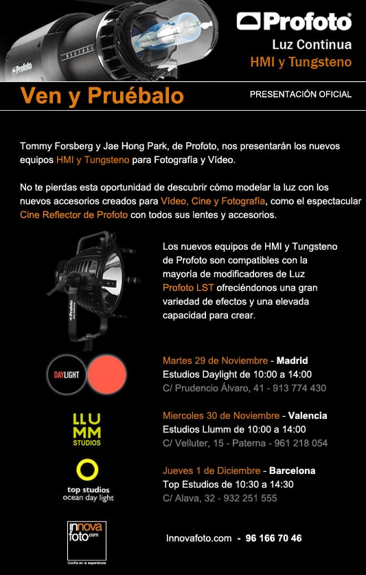 En Innovafoto nos presentan durante esta semana los nuevos equipos para HMI y Tungsteno para fotografía y video. PRESENTACIÓN: Luz Continua Profoto HMI y Tungsteno, Ven y pruébalo. Martes 29 de Noviembre – Madrid Estudios Daylight de 10:00 a 14:00 C/ Prudencio Álvaro, 41 – 913 774 430 Miercoles 30 de Noviembre – Valencia Estudios […]