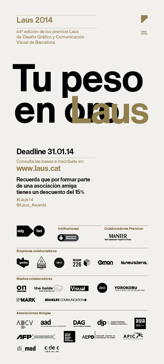 La Asociación de Directores de Arte y Diseñadores Gráficos (ADG-FAD) convoca a los profesionales del diseño y la comunicación visual a participar en la 44ª edición de los Premios Laus. El plazo de inscripción está abierto hasta el día 7 de febrero de 2014. Los asociados a la AFP podrán beneficiarse de un descuento del 15% en las inscripciones. Consulta […]