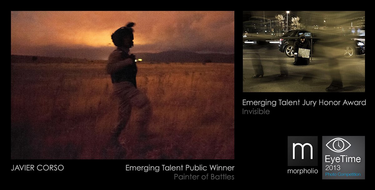 Nuestro asociado junior Javier Corso ha sido premiado en EyeTime 2013 (Morpholio Project) con dos de sus series: “Pintor de batallas”, reconocido como Emerging Talent Public Winner, e “Invisibles”, Premio de Honor. Eyetime 2013 es un concurso de fotografía dirigido a estudiantes, jóvenes profesionales y entusiastas de la fotografía. Está organizado por fotógrafos, profesores y estudiantes, como […]