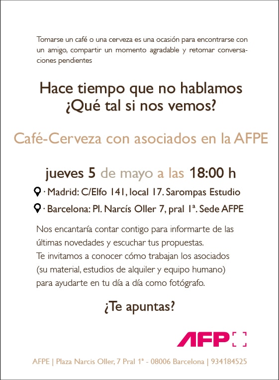 La Asociación de Fotógrafos Profesionales de España ha llegado a un acuerdo con Club de Creativos para que los miembros de la Asociación puedan acceder a los Días C de C con entradas a precios especiales hasta el 16 de febrero. Para solicitar tu código de descuento, escribe un correo a comunicacion@afpe.pro haciendo constar tu interés y recibirás […]