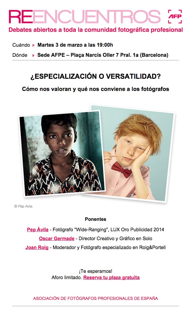 Debate abierto a toda la comunidad fotográfica profesional que contará con la presencia de Pep Ávila (www.pepavila.com) Fotógrafo “Wide-Ranging” y LUX Oro Publicidad de la última edición de los Premios LUX, Oscar Germade Director Creativo y Gráfico en Solo (www.solofficial.com) y Joan Roig, fótografo especializado de Roig&Portell (www.roigportell.com) que hará la función de moderador. ¡Te […]