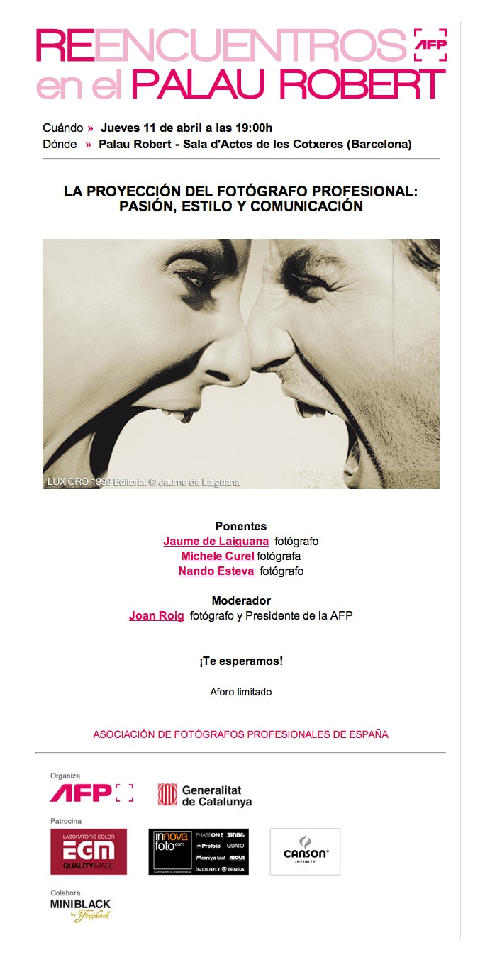 [flagallery gid=3 Name=”Reencuentro La proyección del fotógrafo profesional”] ¡El Reencuentro de ayer fue todo un éxito! Pudimos contar con la presencia de Jaume de Laiguana (fotógrafo), Michele Curel (fotógrafa), Nando Esteva (fotógrafo) y Joan Roig (fotógrafo y Presidente de la AFP) como moderador que nos hablaron de la profesión del fotógrafo, de sus propias trayectorias […]