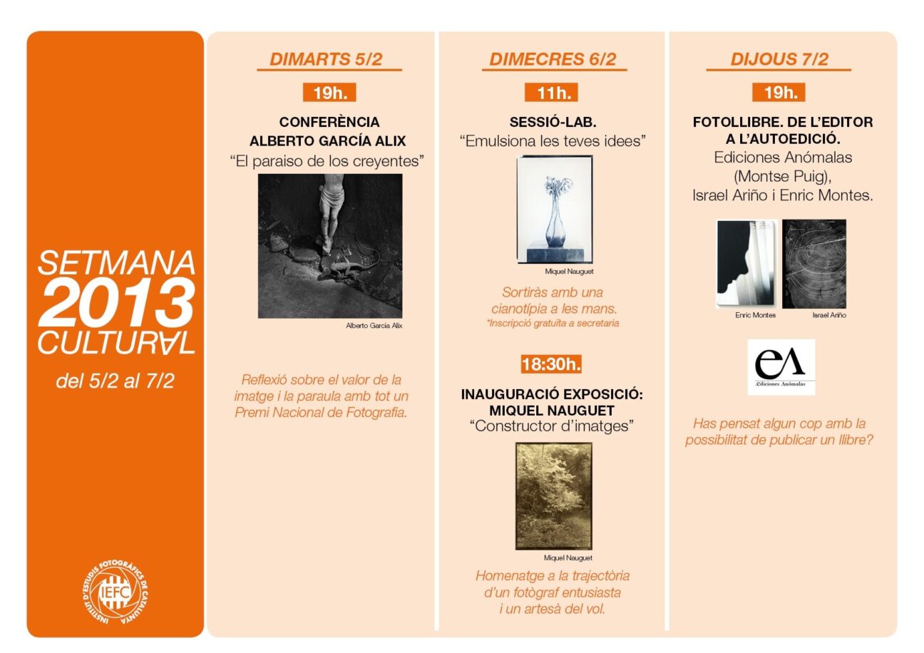 Os invitamos a participar en las actividades que el Institut d’Estudis Fotogràfics organiza dentro de la Semana Cultural del 5 al 7 de febrero. El martes 5 de Febrero de 2013 a las 19h se celebra la conferencia-proyección con Alberto García Alix, dentro de la Semana Cultural del IEFC. Alberto García Alix plantea una reflexión […]