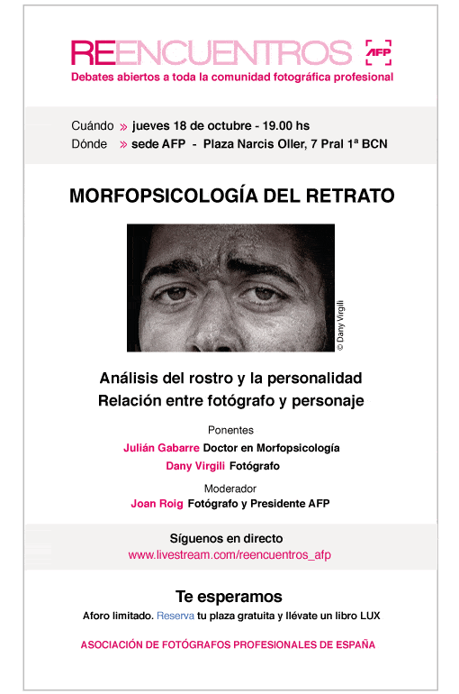 REENCUENTRO AFP “Morfopsicología del Retrato” Debate abierto a toda la comunidad fotográfica profesional que contará con la presencia de Julián Gabarre (Doctor en Morfopsicología), Dany Virgili (Fotógrafo) y Joan Roig como moderador (Fotógrafo y Presidente de la AFP). ¡Te esperamos! El aforo es limitado. Reserva tu plaza gratuita (comunicacion@afpe.pro) Jueves 18 de octubre – 19.00hs Sede AFP ( Plaza Narcís Oller […]