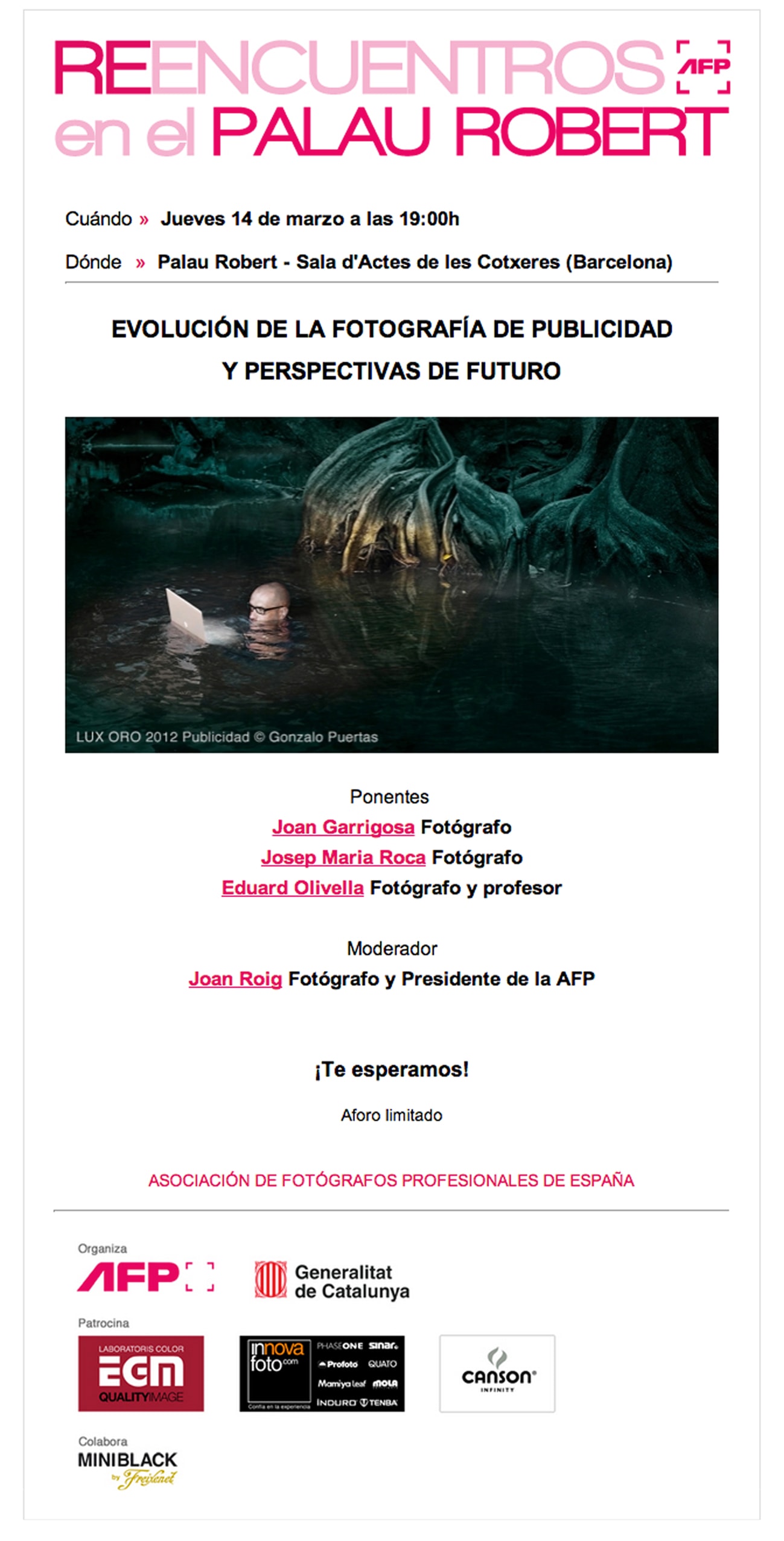 Feb72013Noticias AFPE Categoría: Noticias AFPEPor Asociación de Fotógrafos Profesionales de España7 febrero 2013Deja un comentarioNavegación entre publicacionesAnteriorPublicación anterior:Semana Cultural en el IEFC del 5 al 7 de Febrero (Barcelona)SiguientePublicación siguiente:Reencuentro “La evolución de la fotografía de moda y perspectivas de futuro” 14 de febrero a las 19h en el Palau Robert (Barcelona)Publicaciones RelacionadasEstrategias de Venta para Impulsar tu Negocio Fotográfico con Óscar Lasheras23 octubre 2025La Asociación de Fotógrafos Profesionales de España lanza una campaña para defender la autenticidad de la fotografía humana19 agosto 2025WeTransfer da marcha atrás ante la Inteligencia Artificial21 julio 2025¡Llega Summer Photo Camp [afpe]! Todo un día de Charlas para Crecer, Aprender y Vivir la Fotografía27 junio 2025¡Celebra el Día de la Luz! Charla Inspiradora + Novedades Premios LUX con Eva Casado, Igor Cortadellas y Genaro Massot12 mayo 2025Deja de arriesgarte: Protección de datos para negocios fotográficos con Beatriz de la Fuente30 abril 2025