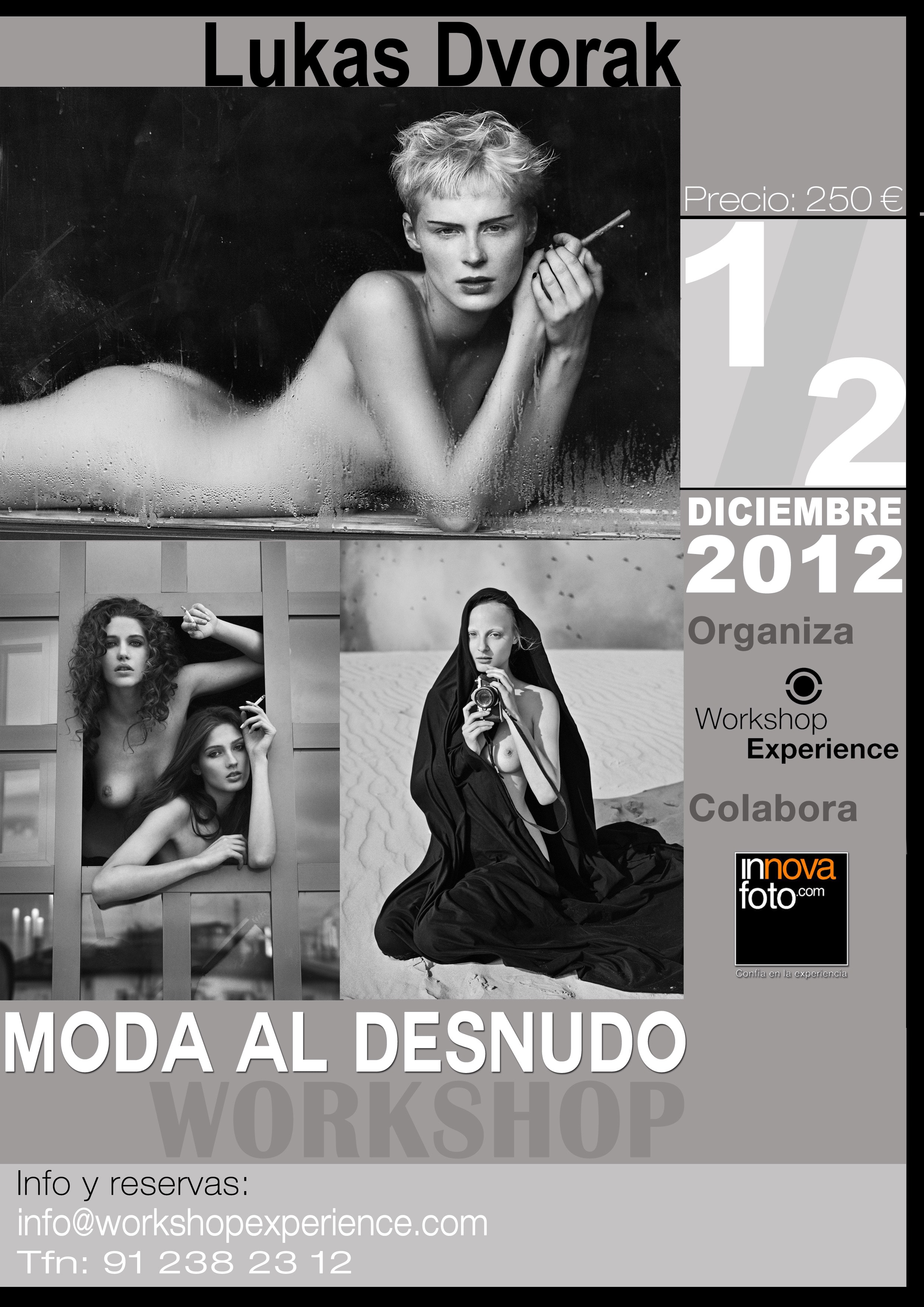 Workshop Experience nos presentan su nuevo taller de Moda al desnudo con Lukas Dvorak, uno de los fotógrafos de más reconocido prestigio en la europa del este, estará realizando un Workshop de desnudo en Workshopexperience a principios de diciembre. Este taller se realiza en colaboración con Innovafoto. El taller se realizará el 1 y el 2 de diciembre, y el horario será de 10:00 h a 14:00 y de 16:00 a 20:00 h sábado y domingo. El precio de este workshop es de 250 € (los asociados AFP se beneficiarán de un 10% de descuento) Información y reserva de plazas: info@workshopexperience.com o en el teléfono 91 238 23 12 Solicita más información sobre el taller.